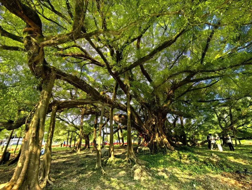 桂林市林业和园林局规划建设科科长李腾钊介绍,榕树的陪伴早已渗透桂林这座城市,从公园到街头,古榕与新植榕树共同撑起城市的“绿色穹顶”,其中不乏一些形态独特、承载故事的榕树。芦笛公园的“孤石独榕”便是极具特色的代表。这棵石山榕高约10米、树冠直径30米,1965年由我国著名风景园林专家张国强与景区职工共同种植。据张国强回忆,当时看到景区附近的榕树已成为“地标”,便与同事陈有财、莫荣娟一同萌生了种植一棵特色榕树的想法。几人在山上发现了一棵生长在片状石头上的榕树,随后小心翼翼地敲碎石头,完整保留其根系,将树移栽至园内。移栽时,他们还特意挑选了一块从山上滚落的石头作为种植基底,榕树的根系分叉恰好与石缝契合,而石头下方肥沃的塘泥,又能为树木生长提供充足养分。