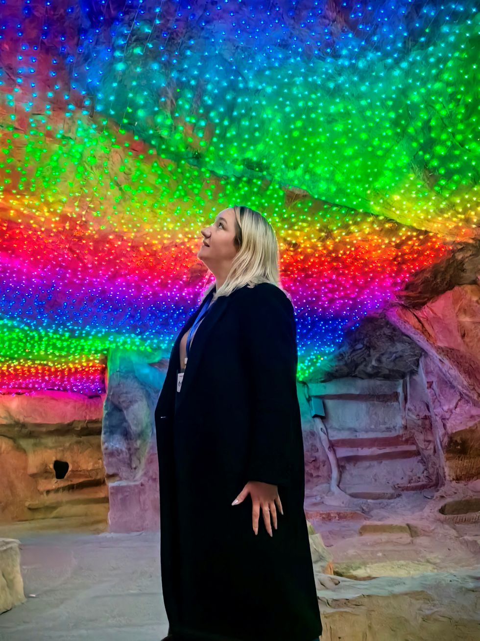 行程尾声,网红博主们来到花山世界 花山谜窟主题园区,解锁智慧旅游新体验。在35号窟,大家跟随以黄山松鼠奇石为原型的虚拟人物“花仔”开启解谜之旅,循着声光电科技营造的悬疑氛围,探寻八大未解猜想,还与NPC演员互动,在动态体验中感受古徽州人文故事。2号窟则通过投影视频、激光灯、雾森等现代设施,打造出“迷雾竹林”“时光隧道”等奇幻场景,裸眼 3D 光影与石窟地貌交织,仿佛穿梭时空。博主们循着游览路线缓缓前行,时而驻足端详岩壁上的凿痕,时而惊叹于光影变幻下的洞窟秘境,纷纷举起相机记录这自然造化与科技赋能的双重魅力。俄罗斯网红博主惊叹:“千年石窟在科技加持下既藏历史厚重,又具现代酷感,真是一个宝藏游览地!”